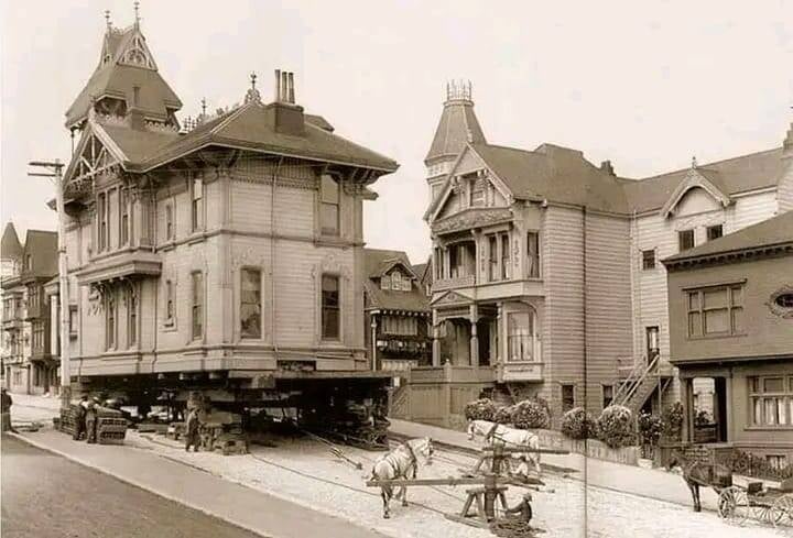 Men begon dit stuk meesterwerk op 26 augustus 1819 ( precies 136 jaar later werd mijn Anneke geboren ) en men was naar de plaats van bestemming geschoven op 8 september van dat jaar. Op onderstaande foto wordt een huis d.m.v. kaapstanders verplaatst. Het is om U een idee te geven.