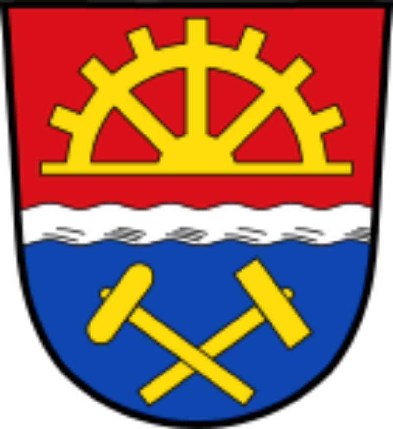 Hierboven staat het heraldische gemeentewapen van Laakirchen. Je ziet een golvende balk, die de Traun voorstelt en het molenrad, dat de papierindustrie voorstelt. Daarboven drie gouden korenaren, die de regionale landbouw vertegenwoordigen.