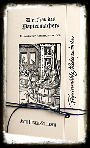 Hieronder staat een gedeelte van de aankondiging van een roman van de papiermaakster van deze watermolen, Antje Henkel-Schilbach uit Zwönitz. De roman komt in 2025 uit en wel in november. Antje staat in het museum met de nieuwe roman. Mooi. hè ?