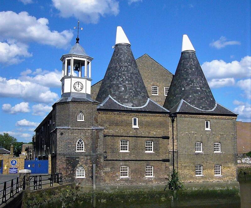 Welke hier niet mag ontbreken, is The Three Mills op de rivier Lea, in het Londense Newham. In de 16e eeuw werden 3 molens 2 molens, House Mill en Clock Mill, één complex. Het schijnt, dat de House Mill de grootste getijdenmolen van de wereld was. In 1878 nog waren er 7 raderen. Tegen de 18e eeuw waren er ongeveer 76 getijdenmolens in Londen, waaronder 2 op London Bridge. Hieronder zie je grote complex van Three Mills, met rechts de Clock Mill.