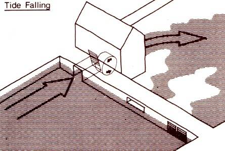 Hierboven staat schematisch weergegeven hoe het tij werkt op het molenrad én het malen.