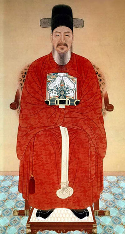 Hierboven staat de zeeheld Yi Sun-sin afgebeeld.